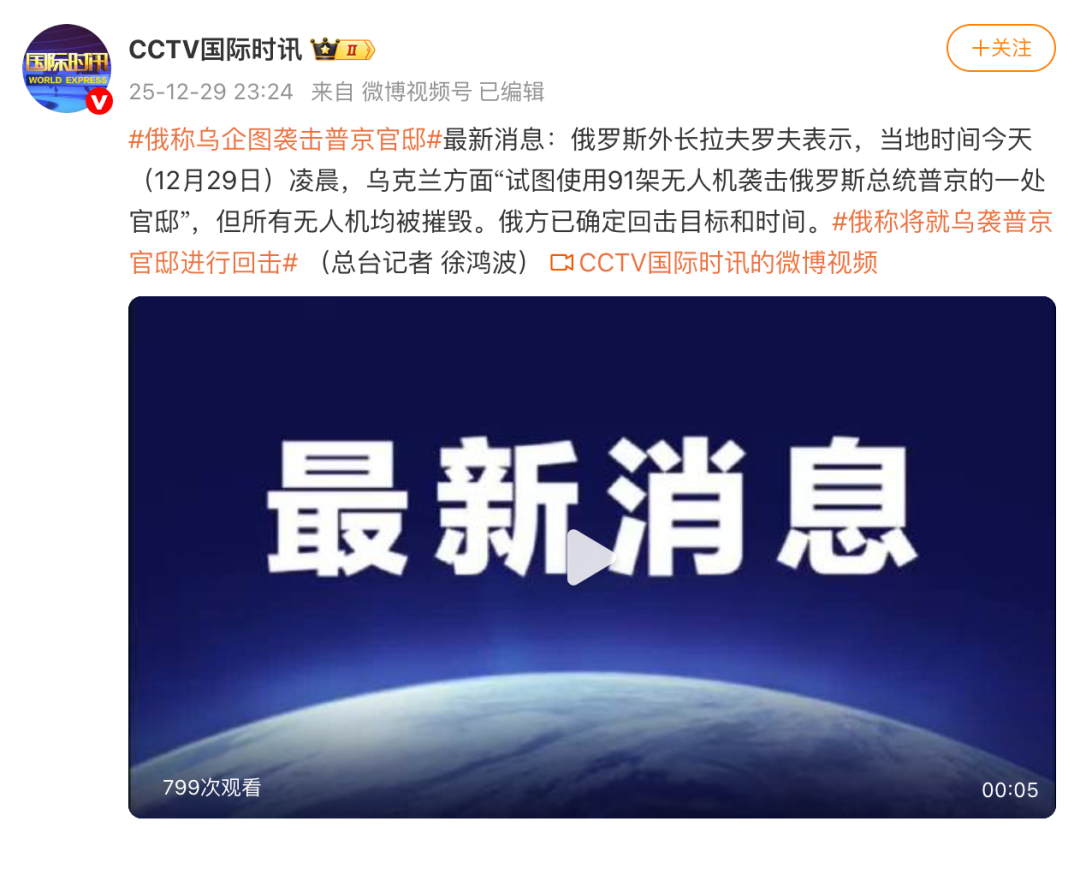 据@CCTV国际时讯 刚刚消息:俄罗斯外长拉夫罗夫表示,当地时间12月29日凌晨,乌克兰方面“试图使用91架无人机袭击俄罗斯总统普京的一处官邸”,但所有无人机均被摧毁。俄方已确定回击目标和时间。