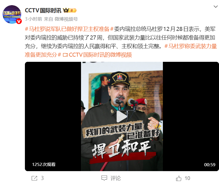 委内瑞拉总统马杜罗12月28日表示,美军对委内瑞拉的威胁已持续了27周,但国家武装力量比以往任何时候都准备得更加充分,继续为委内瑞拉的人民赢得和平、主权和领土完整。