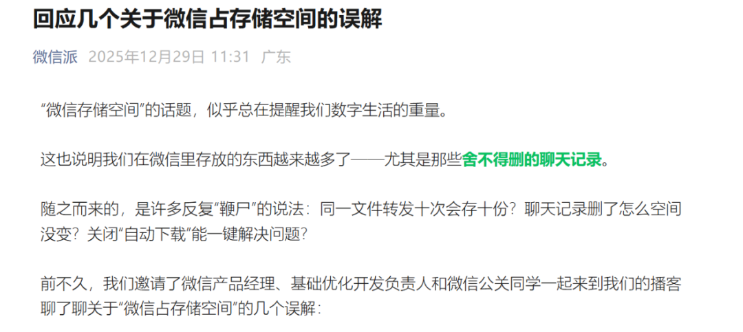 微信官方公众号“微信派”29日午间发文,回应关于“微信占存储空间”的几个误解。