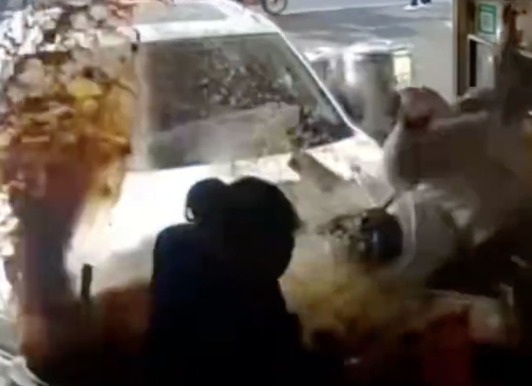 12月28日,有网民发视频称,湖北襄阳一汽车冲入一早餐店。监控显示,店内厨具被撞后,面汤喷溅而出,有两人被瞬间撞飞。