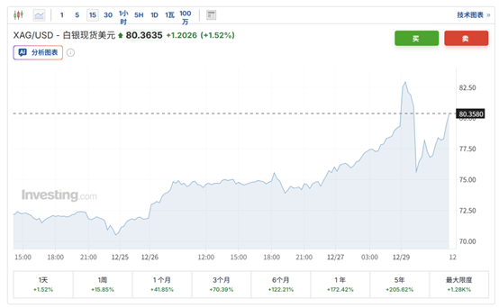 周一,白银市场巨震,上演了 “暴涨后急跌” 的过山车行情:现货白银开盘暴力拉升,一度上涨逾5%,站上83美元/盎司;随后上演高台跳水,一度跌破75美元,日内振幅达9美元;截至发稿,现货白银价格交投在80美元附近。