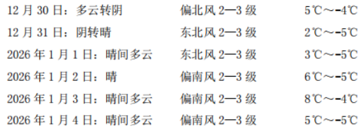 2026年1月1日:晴间多云 偏北风2—3级 3℃~-5℃