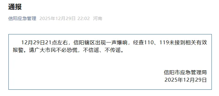 12月29日21点左右,信阳辖区出现一声爆响,经查110、119未接到相关有效报警。请广大市民不必恐慌,不信谣、不传谣。