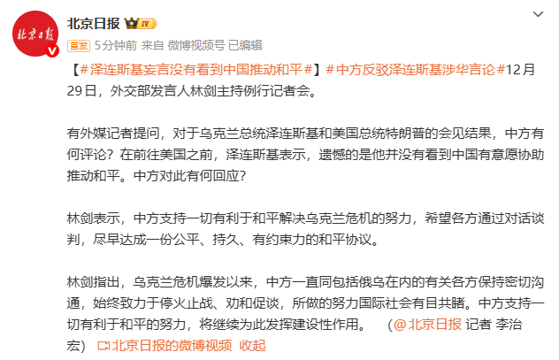 有外媒记者提问,对于乌克兰总统泽连斯基和美国总统特朗普的会见结果,中方有何评论?在前往美国之前,泽连斯基表示,遗憾的是他并没有看到中国有意愿协助推动和平。中方对此有何回应?