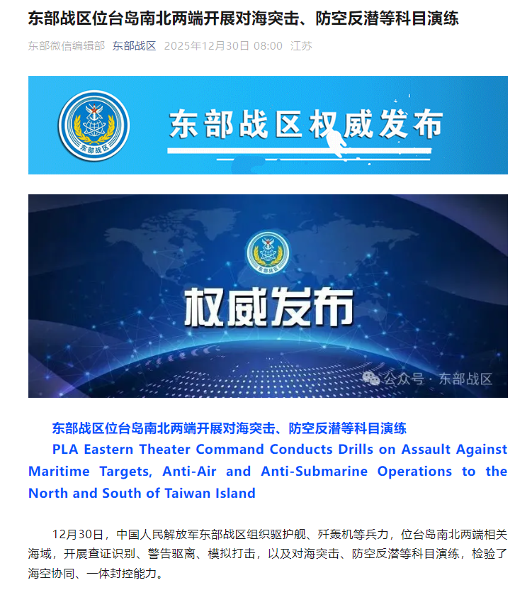 据东部战区,12月30日,中国人民解放军东部战区组织驱护舰、歼轰机等兵力,位台岛南北两端相关海域,开展查证识别、警告驱离、模拟打击,以及对海突击、防空反潜等科目演练,检验了海空协同、一体封控能力。