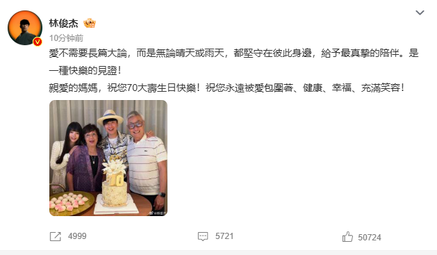 刚刚林俊杰发微博晒出和女友一起陪妈妈庆生的温馨合照正式官宣恋情!