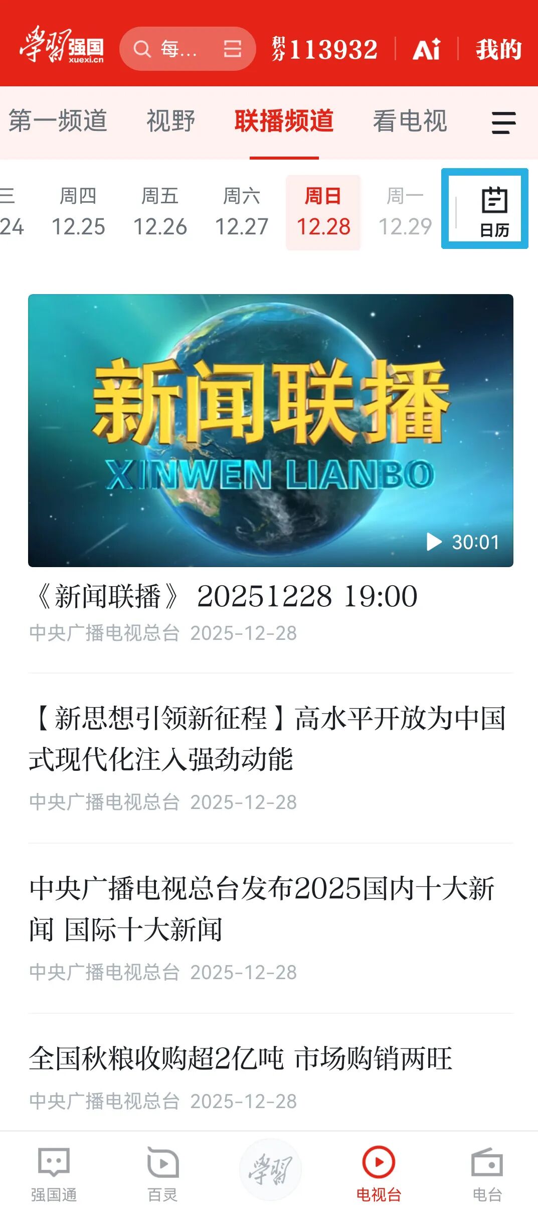 打开“学习强国”APP,点击底部“电视台”按钮,找到联播频道,可以看到最上方的“日历”按钮。