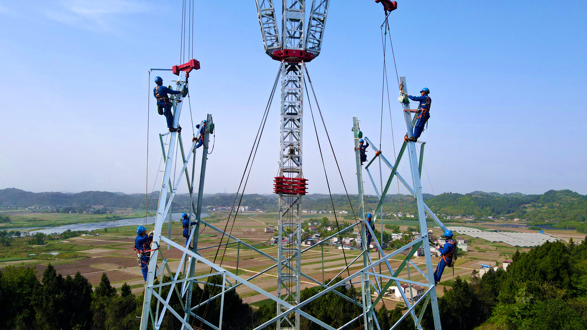 成都空港500千伏输变电工程铁塔组立,该项目于2025年11月投运。(陈红梅 摄)