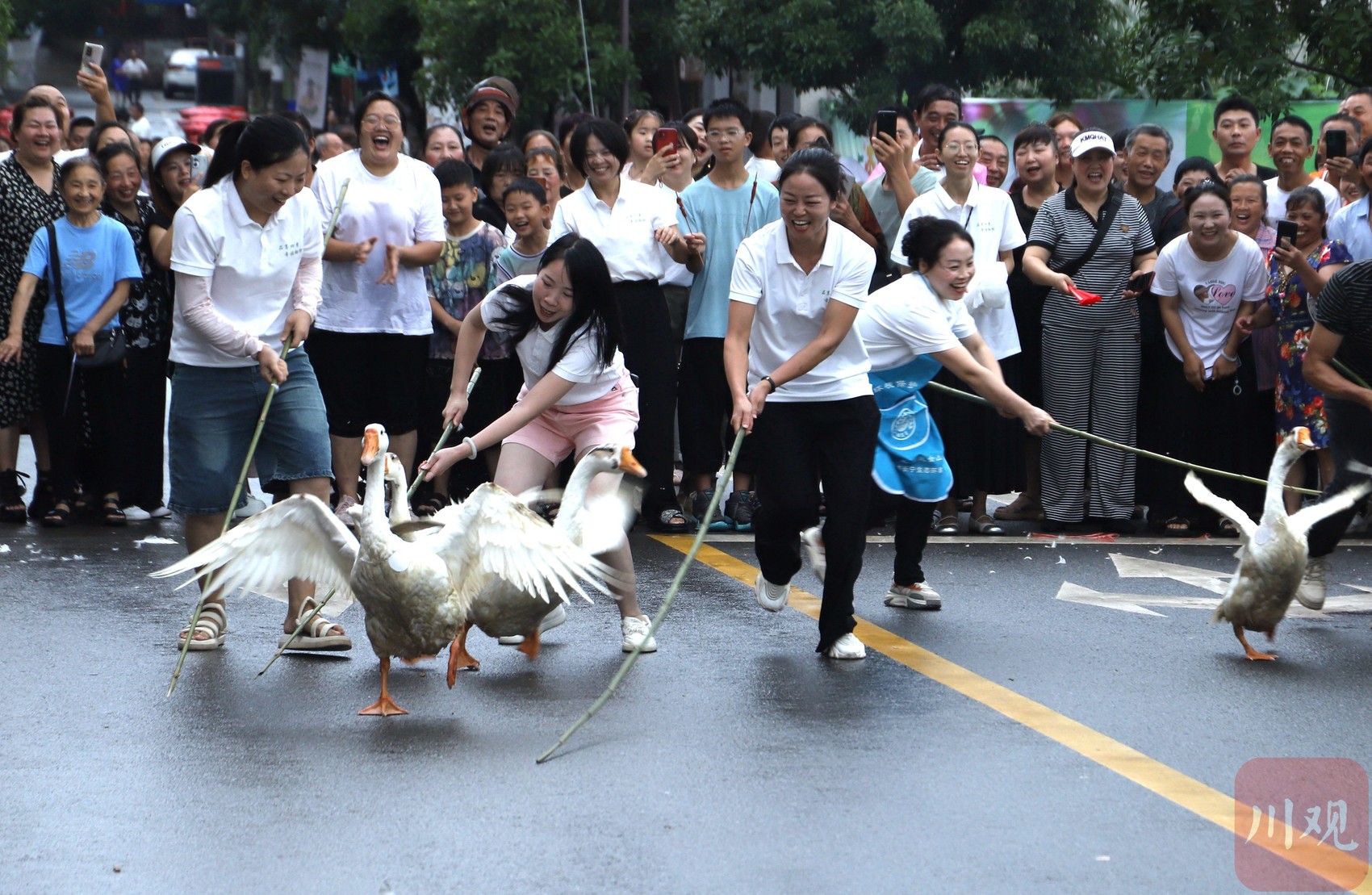 7月11日,宜宾市长宁县铜锣镇推出了一场集采摘、民俗与美食体验于一体的农文旅活动。现场游客积极参与赶鹅等趣味游戏,感受乡村生活的生动气息。