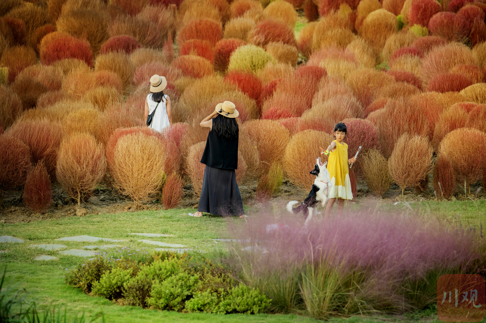 10月3日,成都双流空港花田的粉黛乱子草与地肤草正值最佳观赏期,绯红与橙红交织的秋色吸引众多市民前来赏景游玩,乐享秋日时光。