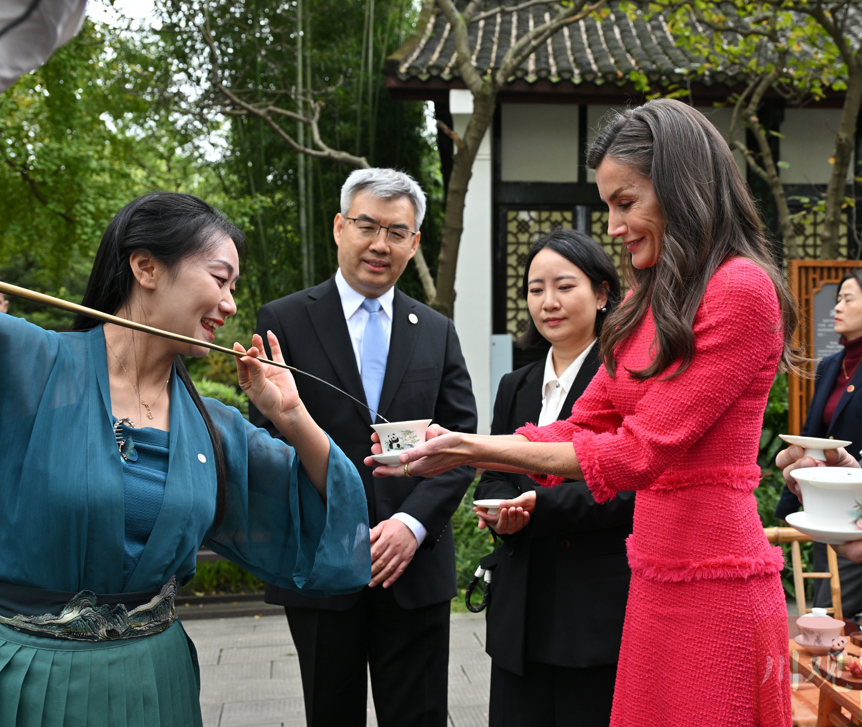 茶,这一源于中国的饮品,不仅在中国深受喜爱,更在全球范围内拥有众多拥趸。11月11日,西班牙王后莱蒂西娅(右一)在成都望江楼公园体验川派中国茶。