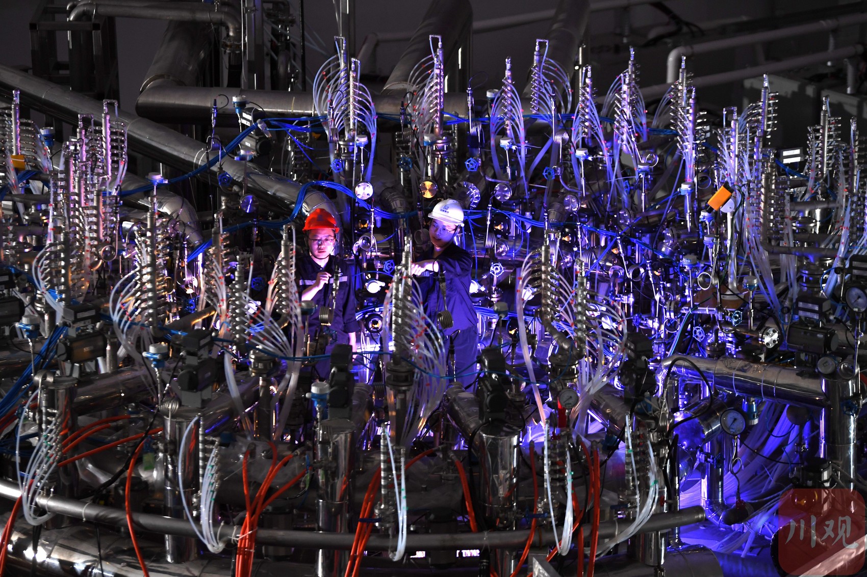 2025年,我国自主研发的新一代人造太阳“中国环流三号”连续取得重大进展:实现等离子体电流100万安培、离子温度1亿摄氏度、高约束模式运行,创下我国聚变装置运行新纪录。图为6月7日,科技人员在装置顶部检查调试。