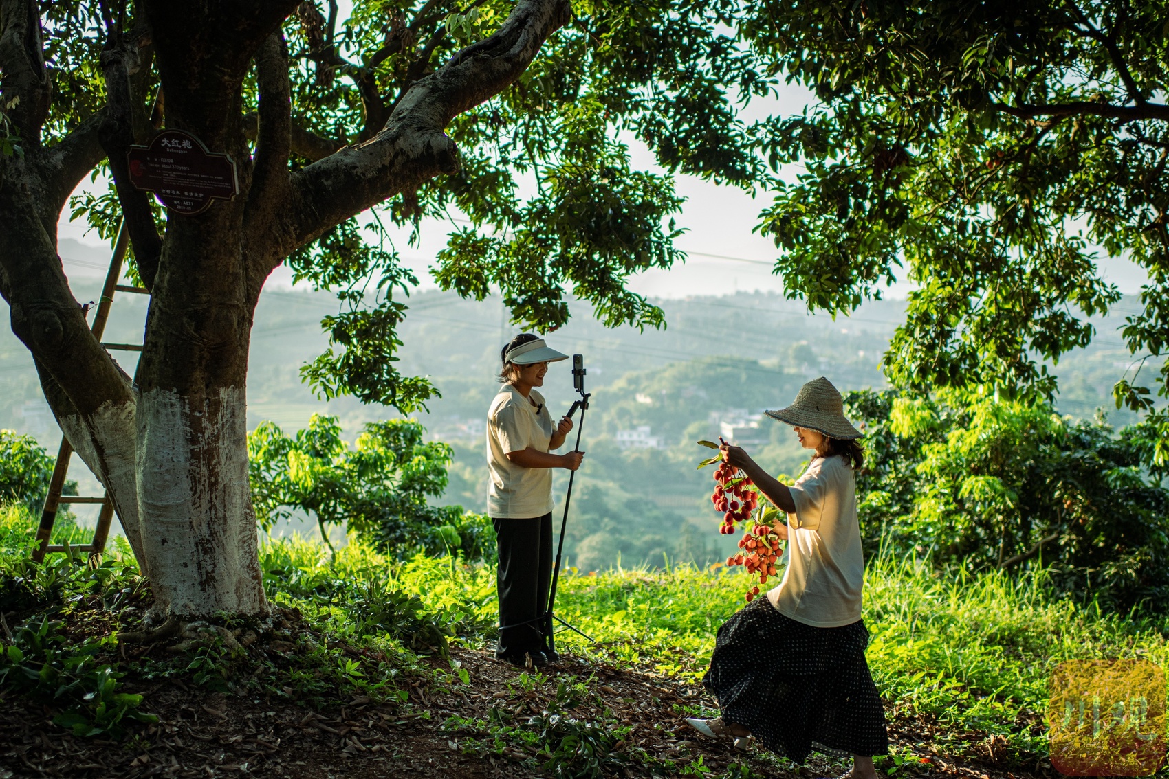 2025年夏,电影《长安的荔枝》热播,合江荔枝顺势“出圈”。泸州市合江县荔江镇荔枝古树公园是全省首批古树公园之一,丰收季,有着370年树龄的“妃子笑”枝头缀满果实。图为7月16日清晨,新农人姜晓霞(右)带着团队在荔枝古树公园内直播带货。