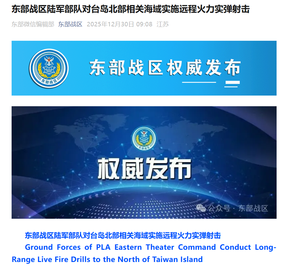 据东部战区今日(12月30日)消息,东部战区新闻发言人李熹海军大校表示,12月30日9时00分,中国人民解放军东部战区陆军部队,组织对台岛北部相关海域,实施远程火力实弹射击,取得了预期效果。