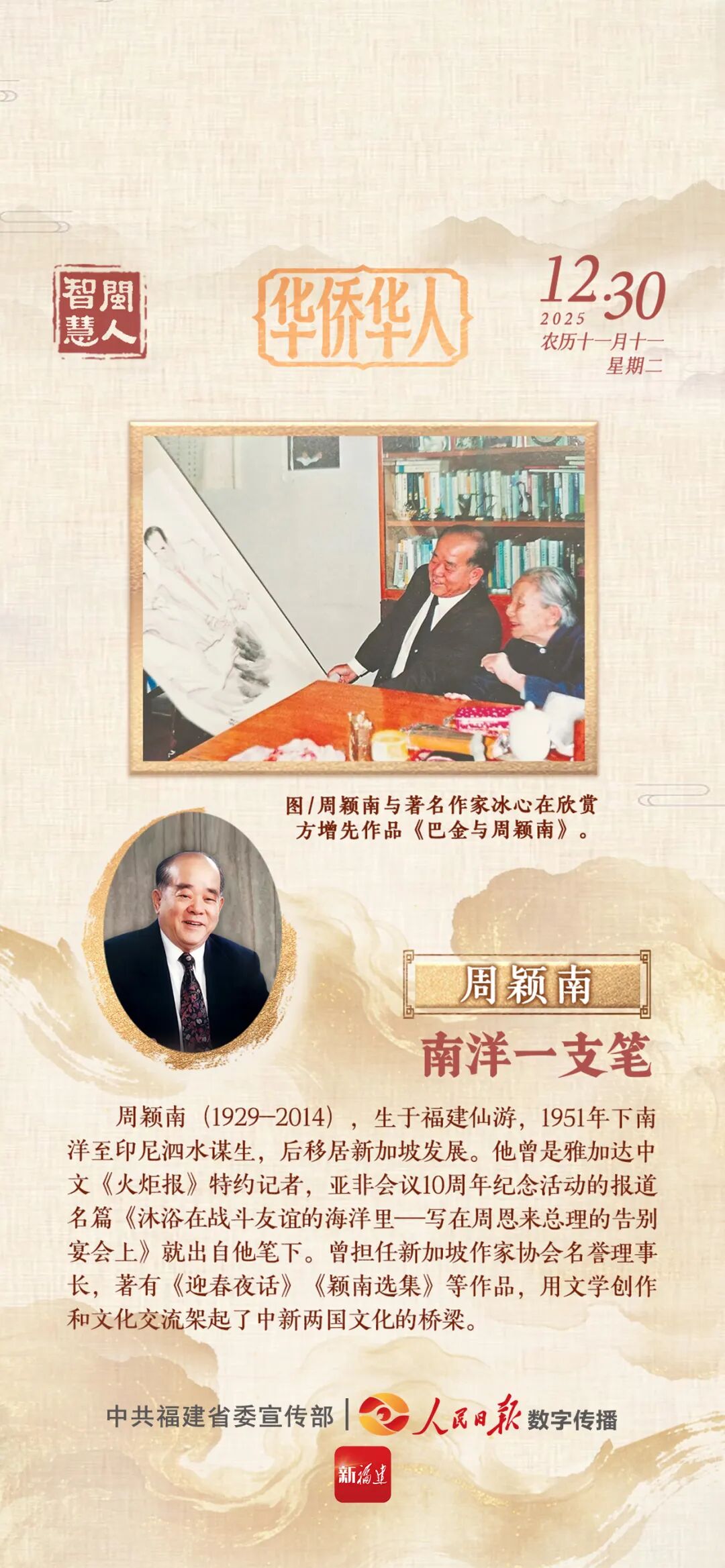 周颖南(1929—2014),生于福建仙游,1951年下南洋至印尼泗水谋生,后移居新加坡发展。他曾是雅加达中文《火炬报》特约记者,亚非会议10周年纪念活动的报道名篇《沐浴在战斗友谊的海洋里——写在周恩来总理的告别宴会上》就出自他笔下。曾担任新加坡作家协会名誉理事长,著有《迎春夜话》《颖南选集》等作品,用文学创作和文化交流架起了中新两国文化的桥梁。