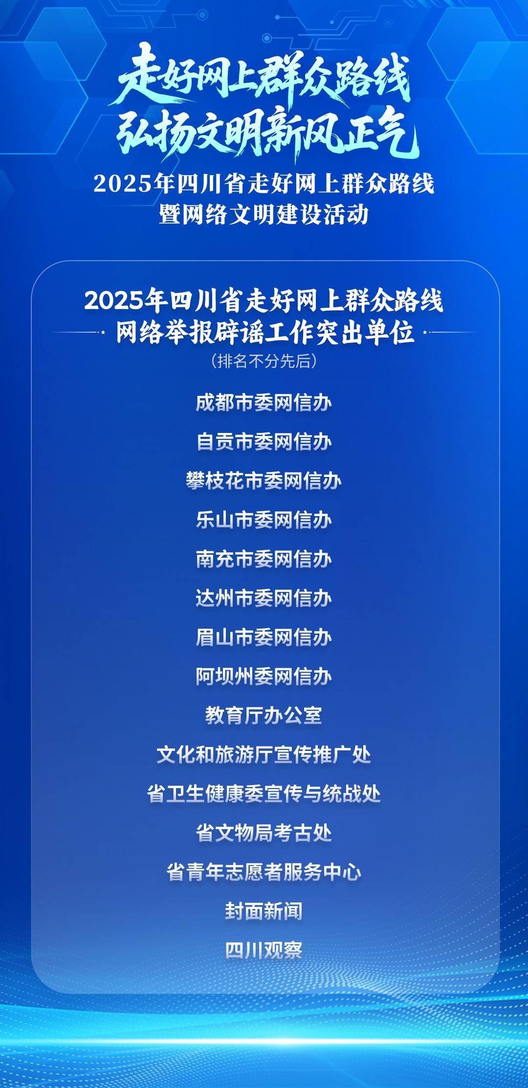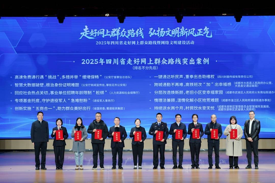 现场还为2025年走好网上群众路线突出政务新媒体账号、走好网上群众路线突出案例、走好网上群众路线突出融媒体中心网络平台、四川省网络法治宣传优秀案例、网络举报辟谣工作突出单位进行了颁奖,以典型引领激发各地各部门工作活力。