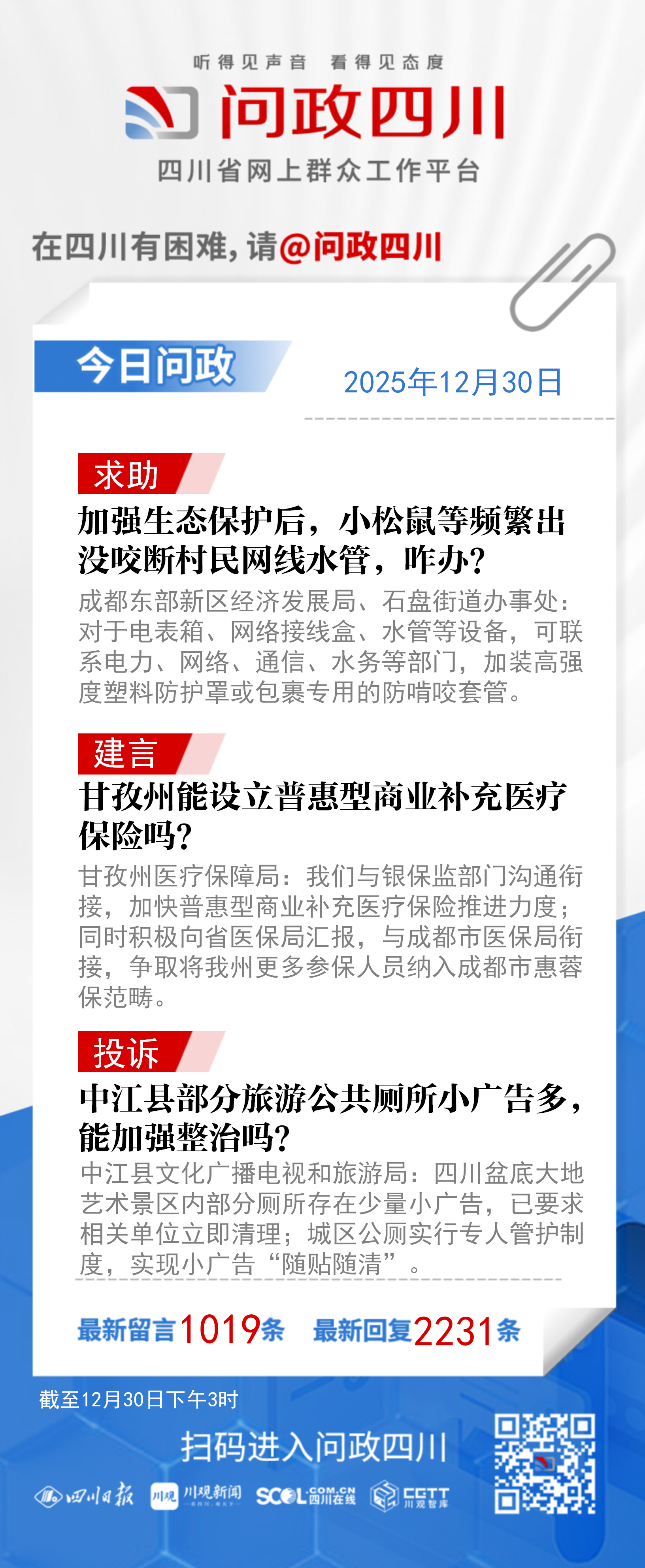 问政四川网友提问:成都东部新区近年来生态保护成效显著,我们谢家祠村野生动物如小松鼠等频繁出没。然而,这些小动物时常咬坏村民户外的网线、水管等设施,即使修复后也屡遭破坏,给村民日常生产生活带来持续困扰。希望相关部门能够协调研究,帮助解决这一问题。