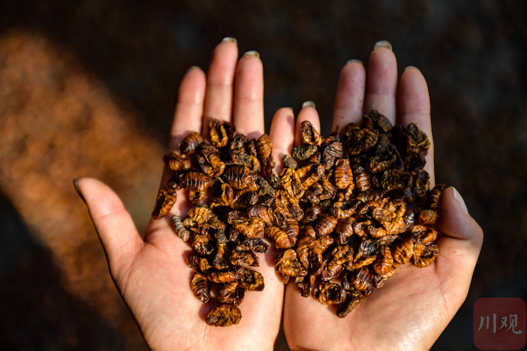 2025年12月28日,在位于攀枝花市盐边县桐子林镇金河村的中丝天成(攀枝花)丝绸公司缫丝厂内,工作人员查看晾晒的蚕蛹。