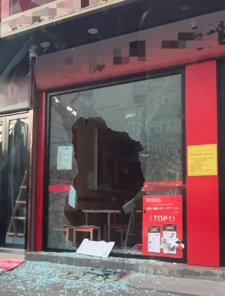 目击者拍摄的视频显示,该店落地窗被砸了一个大洞,碎玻璃散落在店内外。正在店内清扫玻璃的人员表示,落地窗在凌晨被人砸了,已报警。