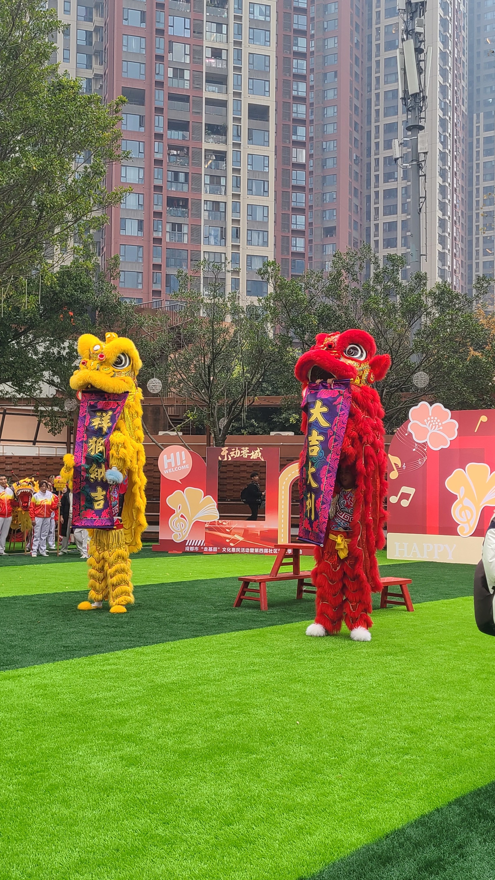 双狮腾跃,双龙起舞。东郊记忆里,欢乐民俗表演巡游全场,游客市民开心迎新年。