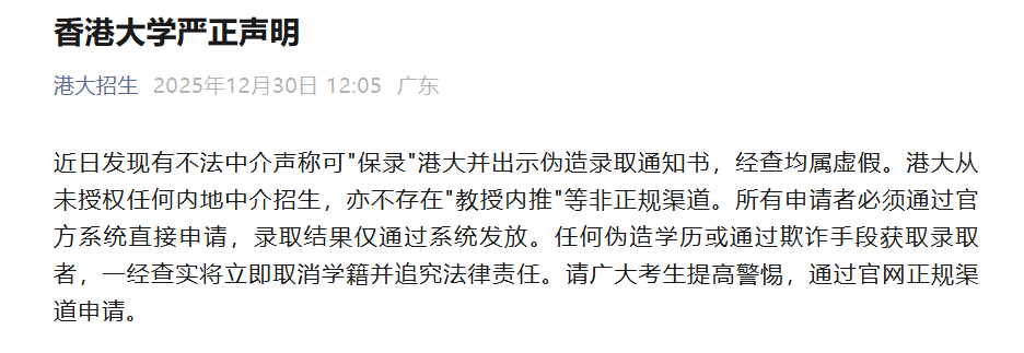 近日发现有不法中介声称可“保录”港大并出示录取通知书,经查均属伪造。港大从未授权任何内地中介招生,也不存在“教授内推”等非正规渠道。所有申请者必须通过官方系统直接申请,录取结果仅通过系统发放。