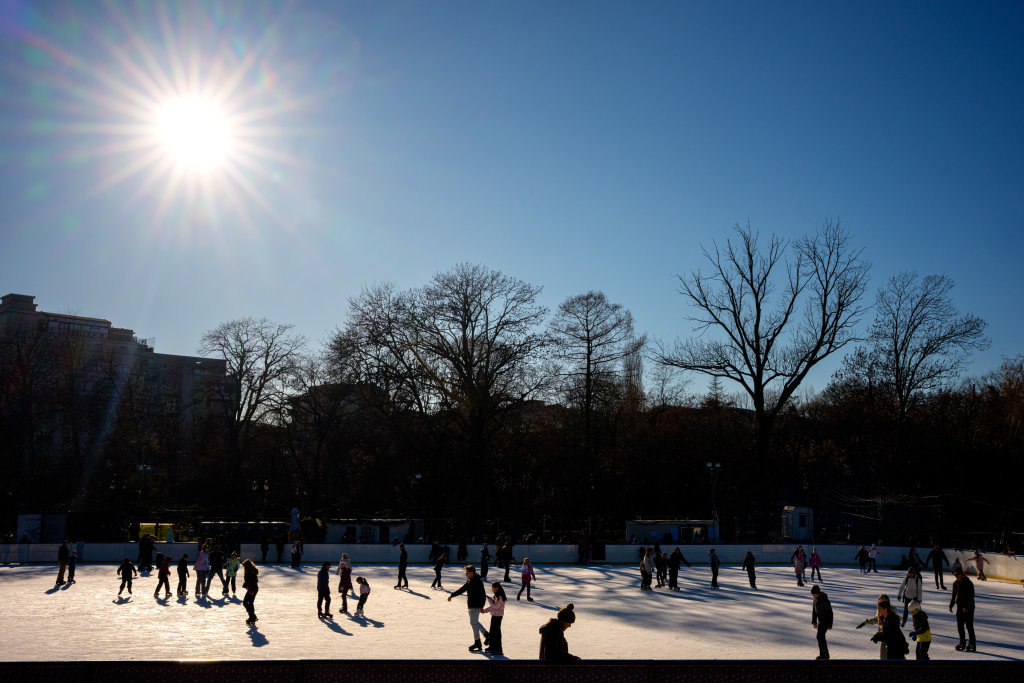 12月29日,人们在罗马尼亚布加勒斯特一处人造冰场上滑冰。