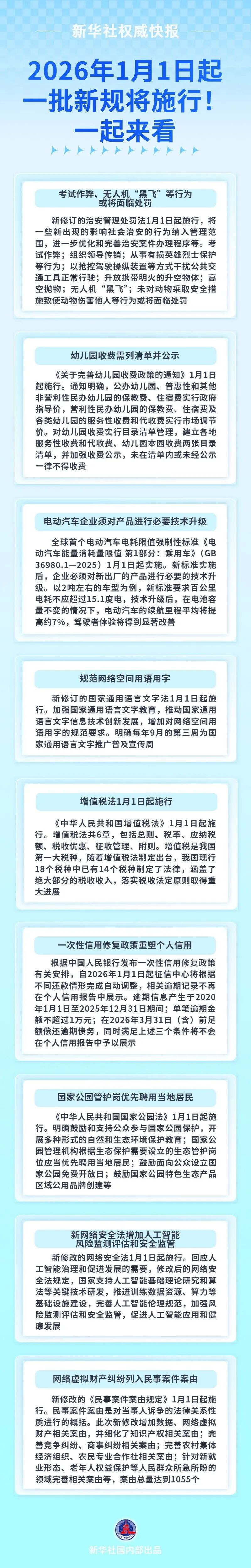 2026年1月1日起,一批新规将施行,事关社会治安、保育教育、电动汽车、网络安全等多方面,更好回应群众关切,护航美好生活,增添发展活力……一起来看,哪些你最关注?