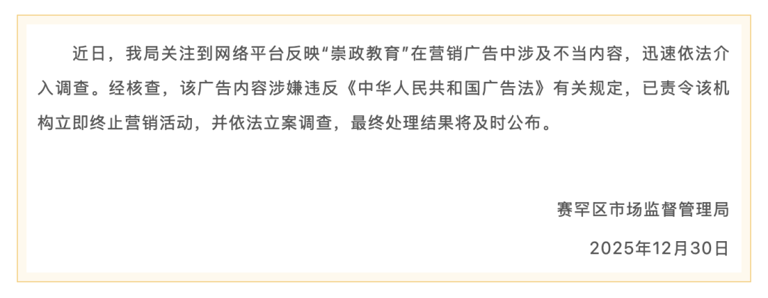 近日,我局关注到网络平台反映“崇政教育”在营销广告中涉及不当内容,迅速依法介入调查。经核查,该广告内容涉嫌违反《中华人民共和国广告法》有关规定,已责令该机构立即终止营销活动,并依法立案调查,最终处理结果将及时公布。