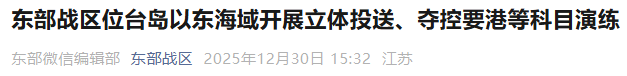 12月30日,中国人民解放军东部战区位台岛以东海域,组织两栖攻击舰编队、驱护舰编队、无人机等兵力,开展立体投送、精兵破袭、夺控要港等科目演练,检验了编队协同、体系作战、精打击要能力。