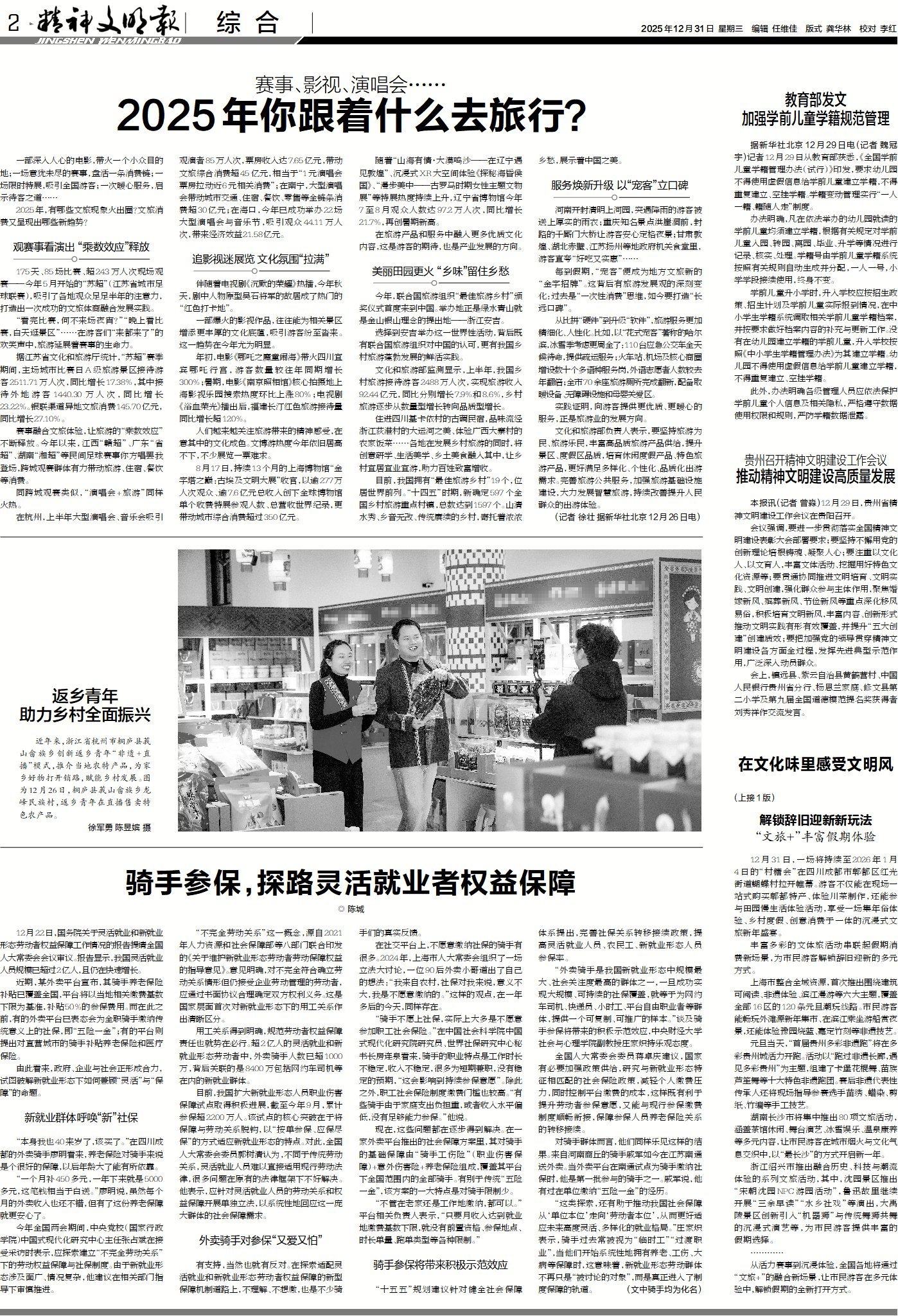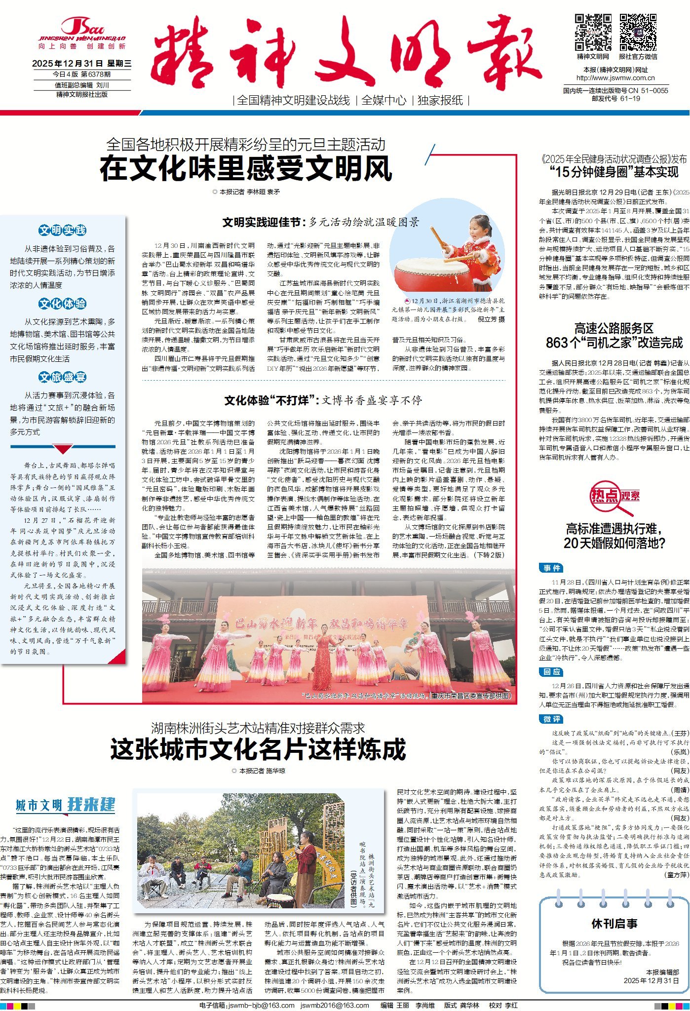 今日版面“早”知道:1版头条聚焦各地以传统韵味、现代风味、文明风尚,营造“万千气象新”的元旦氛围;《城市文明我来建》栏目带你走进湖南株洲,看街头艺术站精准对接群众需求,让群众成为城市文明建设的主角;《热点观察》栏目探讨四川20天婚假政策“热发布”遭遇企业“冷执行”,政策如何才能落地。2版“综合”版关注2025年有哪些文旅现象火出圈?文旅消费又呈现出哪些新趋势?