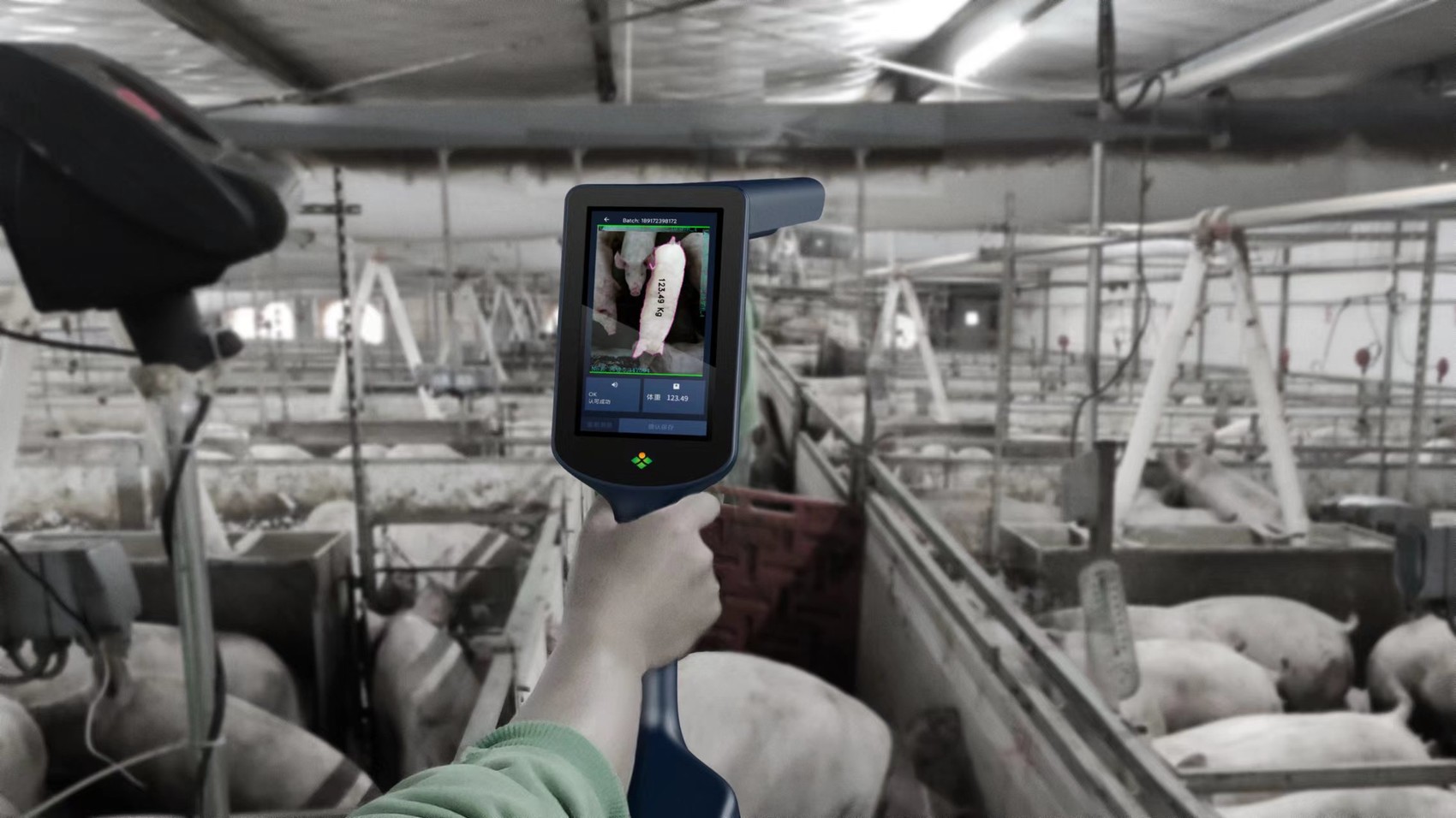 新希望专业技术人员使用自主研发的手持智能估重设备,对猪只进行体况检测。