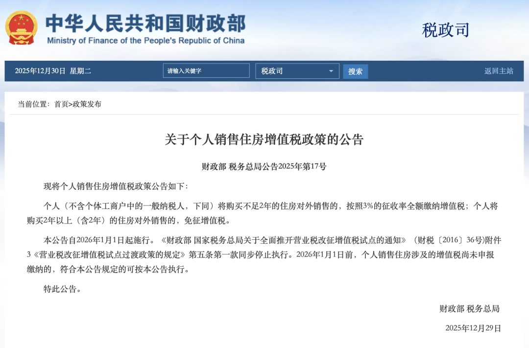 据财政部网站消息,财政部、国家税务总局12月29日发布“关于个人销售住房增值税政策的公告”: