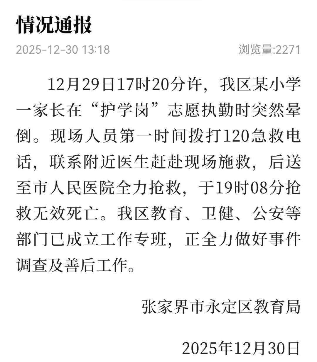 湖南张家界市永定区教育局12月30日下午发布通报,12月29日17时20分许,永定区某小学一家长在“护学岗”志愿执勤时突然晕倒。现场人员第一时间拨打120急救电话,联系附近医生赶赴现场施救,后送至市人民医院全力抢救,于19时08分抢救无效死亡。