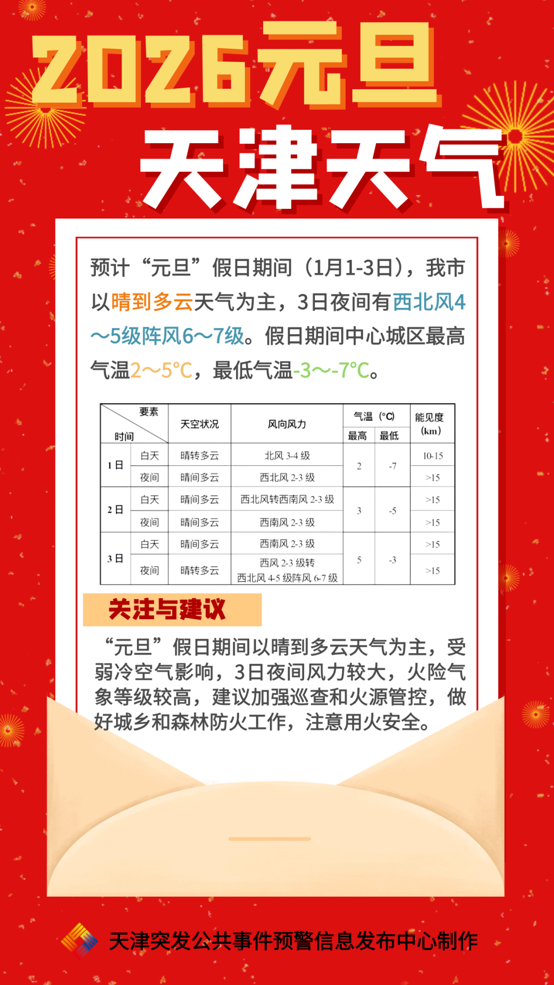 预计2026年元旦假期(1月1日至3日)我市天气以晴到多云为主,1日最高气温仅在2℃上下,2日回升至3℃左右,3日回升至5℃;夜间最低气温-7~-3℃,北部地区-9℃左右。此外,受弱冷空气影响,3日夜间风力加大至西北风4-5级阵风6-7级。