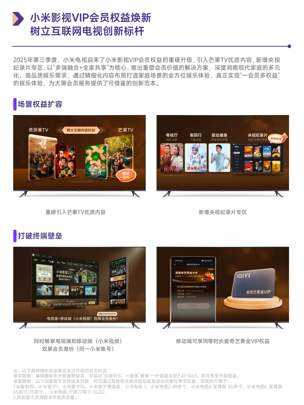 面对家庭内部多元且分散的兴趣偏好,如何通过一个会员体系满足全家需求,成为行业探索的焦点。2025年小米影视VIP在原有的爱奇艺、粤视厅、梨园行、爱动健身内容基础上,重磅升级引入芒果TV内容及央视纪录片专区,率先实践“一会员多权益”的服务模式。