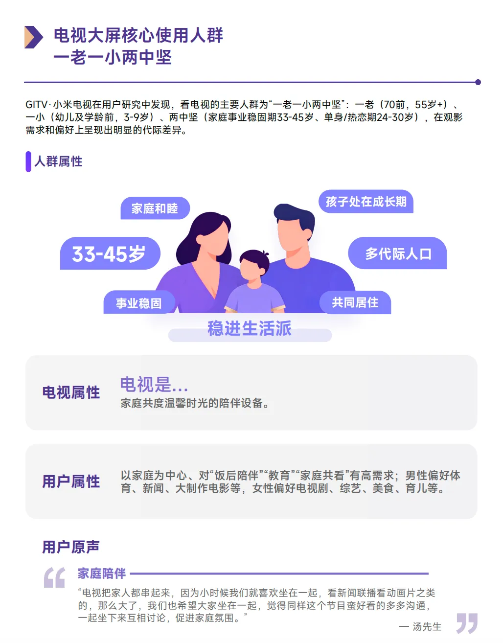 基于连续五年的深度研究,白皮书首次系统描绘出中国家庭“一老一小两中坚”的核心收视结构,并精准划分为“稳进生活派”“乐享悦己族”“萌娃成长营”及“安养鉴赏家”四类典型人群。这一精细化画像揭示,大屏运营的核心逻辑正从服务个体观众,深刻转向服务以家庭为单位的复合型需求。