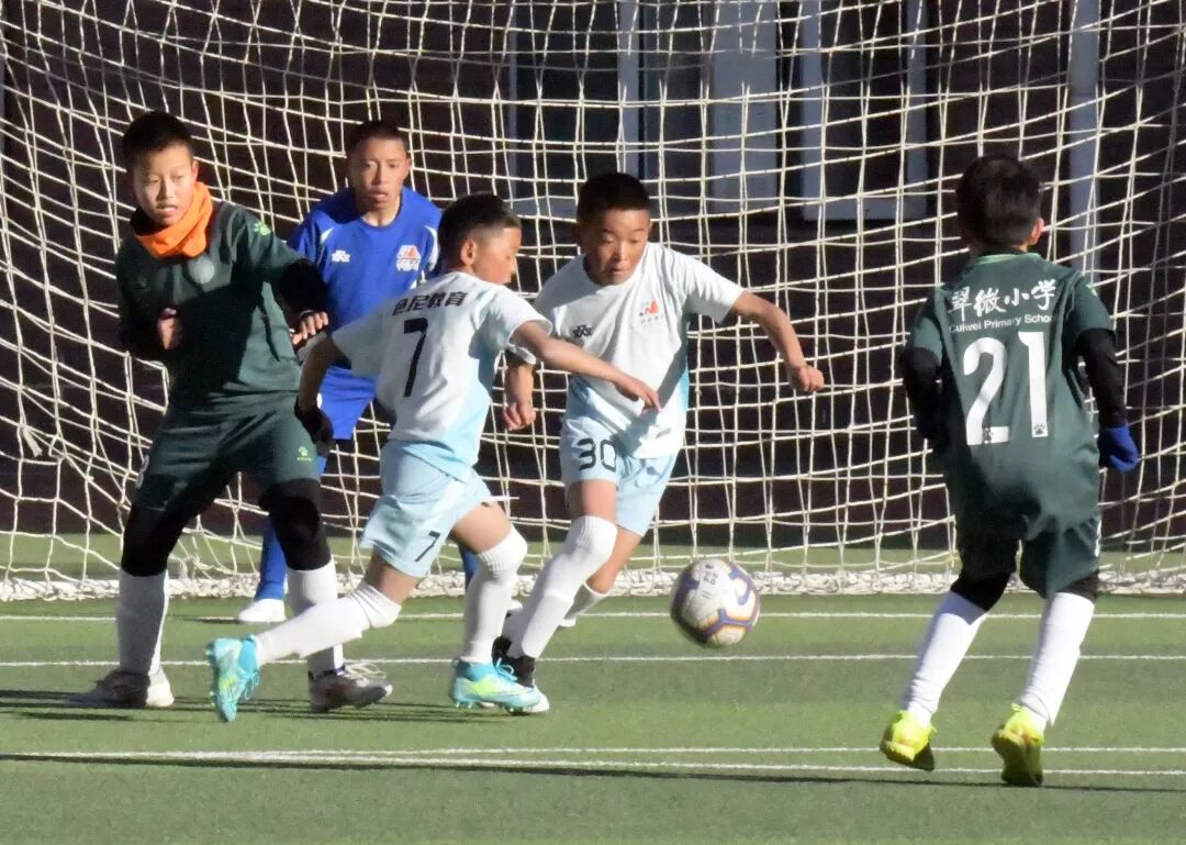 图为绿茵场上,两地小朋友间的一场足球友谊赛正激烈进行。