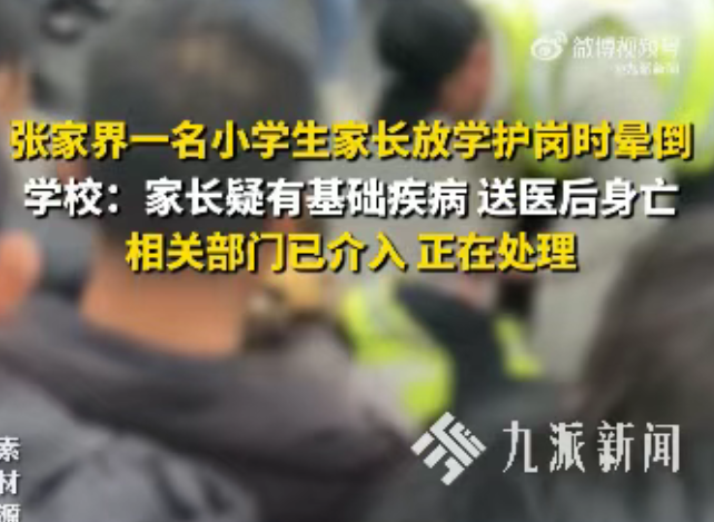 12月29日下午,在张家界永定区一所小学门口,一位家长在站护学岗时突然晕倒,送医后身亡。