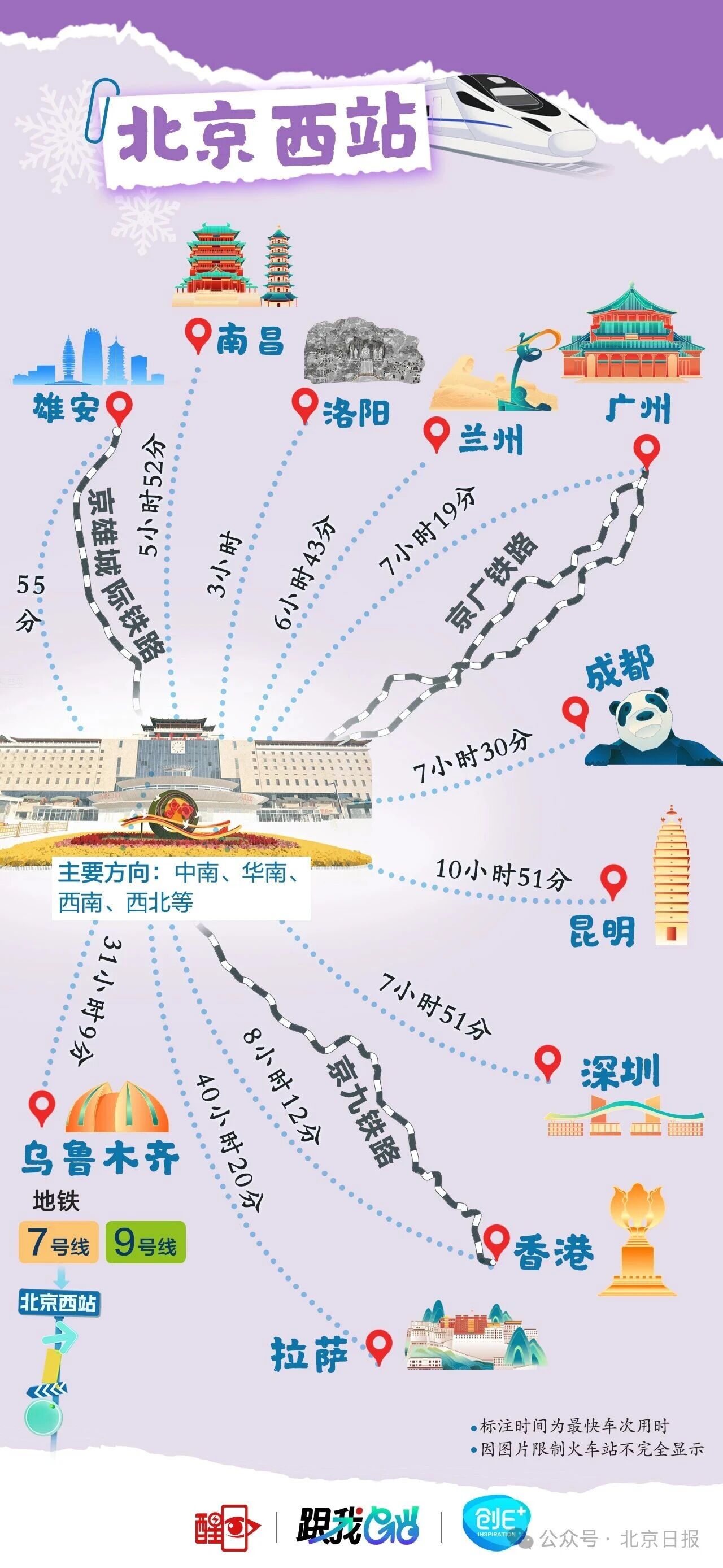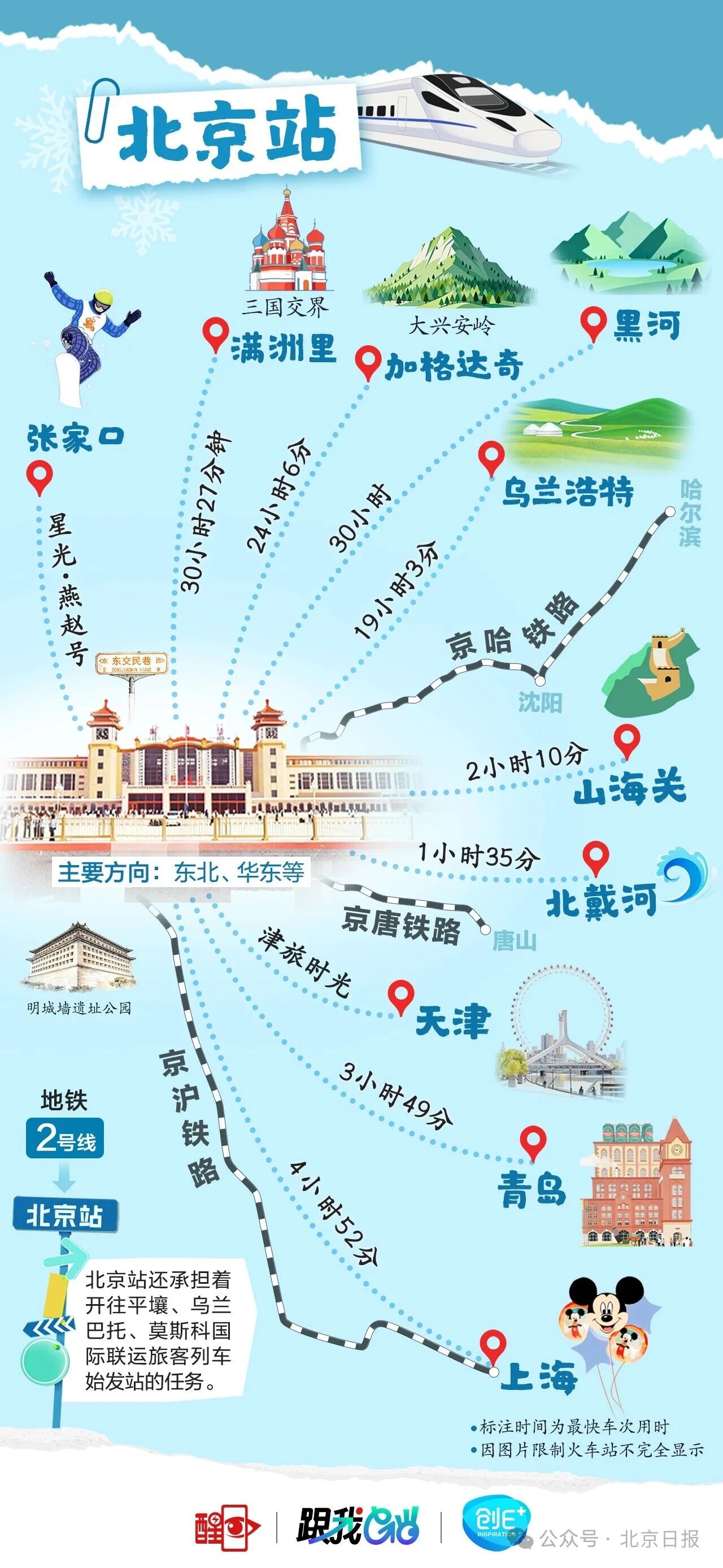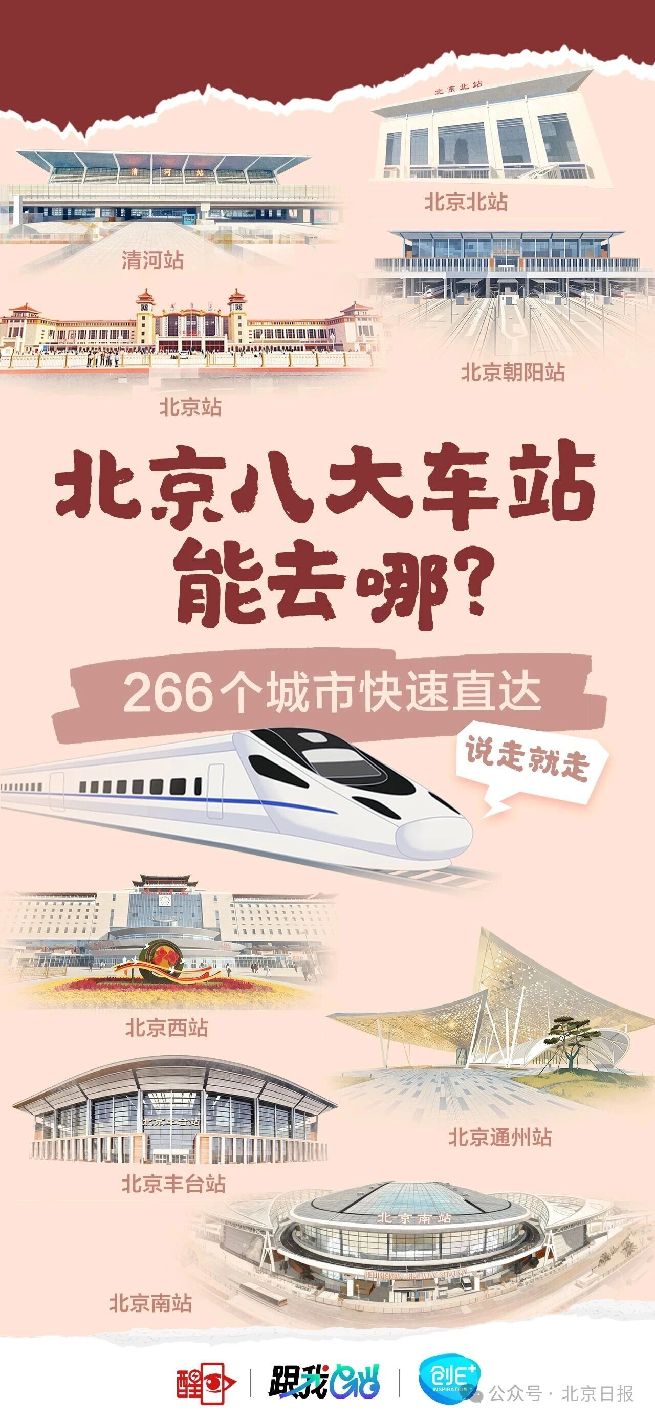 今天,北京通州站正式开通运营,北京八大火车站正式“集结”完毕。北京是全国铁路网的中心。从北京出发,无论是到银装素裹的东北冰雪世界,还是到四季如春的西南花溪河畔……八大火车站都有直达的列车。八站“各司其职”,按方向“分工”。例如,东向及东北向的铁路列车由北京站、北京朝阳站及北京通州站承担,西北向的铁路列车由北京北站、清河站承担,西南向的列车由北京西站、北京丰台站承担,东南向的列车由北京南站承担。如今,北京八大火车站出发,可以直达全国266个城市。风驰电掣的高铁、怀旧风满满的绿皮火车、定点定线的旅游列车,串联起祖国的大好河山。收藏这份时间表,趁着周末或假期,去邂逅“诗与远方”吧!(因图片限制各地火车站不完全显示,标注时间为最快车次用时)监制:赵中鹏 刘昊 付堃记者:胡子傲 李俊瑶美编:关印 杨盼 琚理 赵凯峰 吴薇