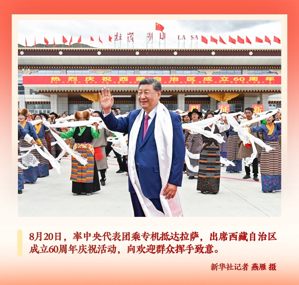 青藏高原,秋风送爽。8月20日,当习近平总书记乘坐的专机在机场降落,等候在停机坪的西藏各族各界群众热烈欢呼起来。习近平作为中共中央总书记、国家主席、中央军委主席率中央代表团到西藏出席西藏自治区成立庆祝活动,这在党和国家历史上是第一次。洁白哈达、切玛和青稞酒、欢快的民族舞蹈、红旗和五彩花束的海洋……各族群众深情表达着对总书记的热烈欢迎与真诚祝福。