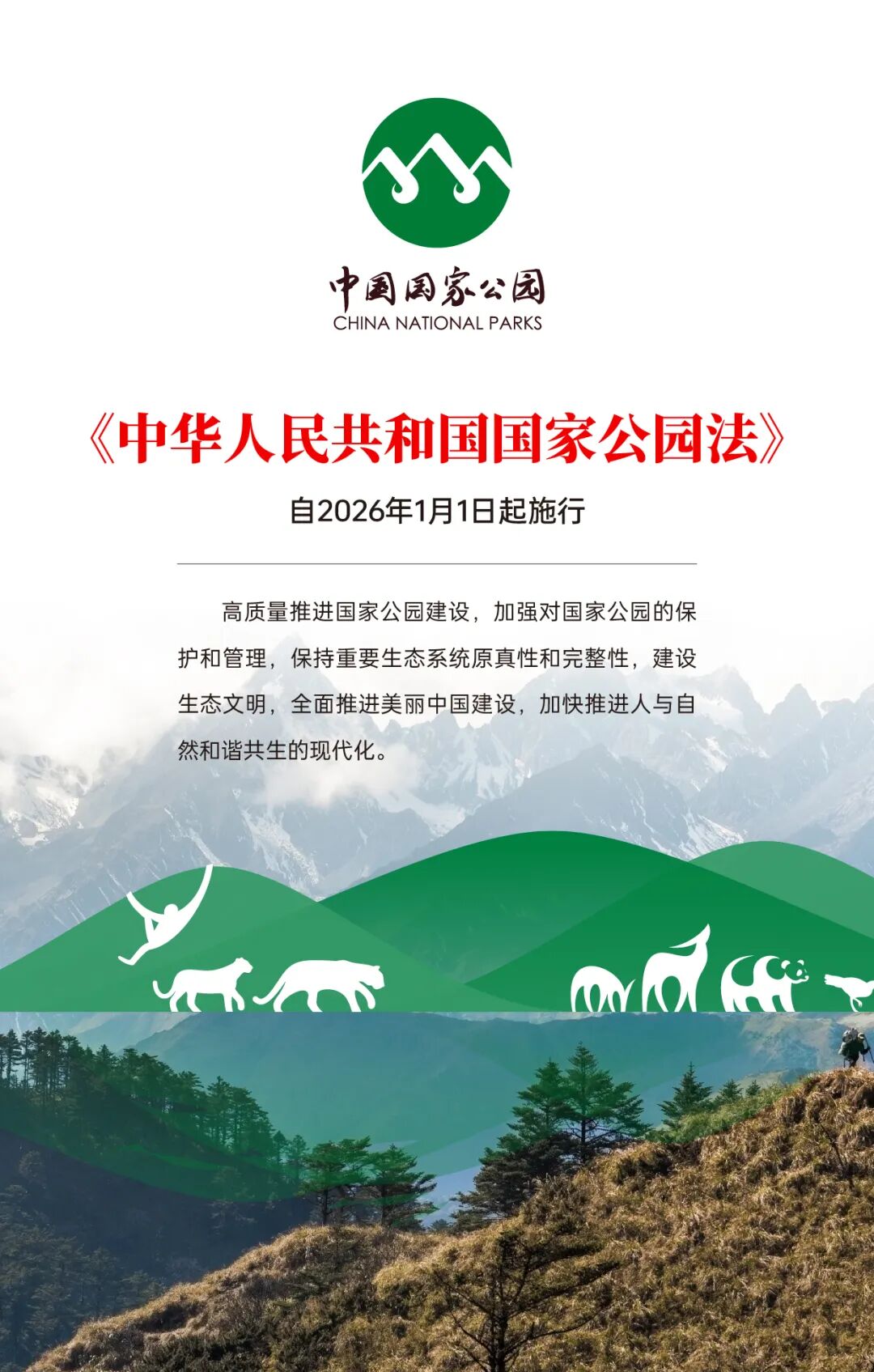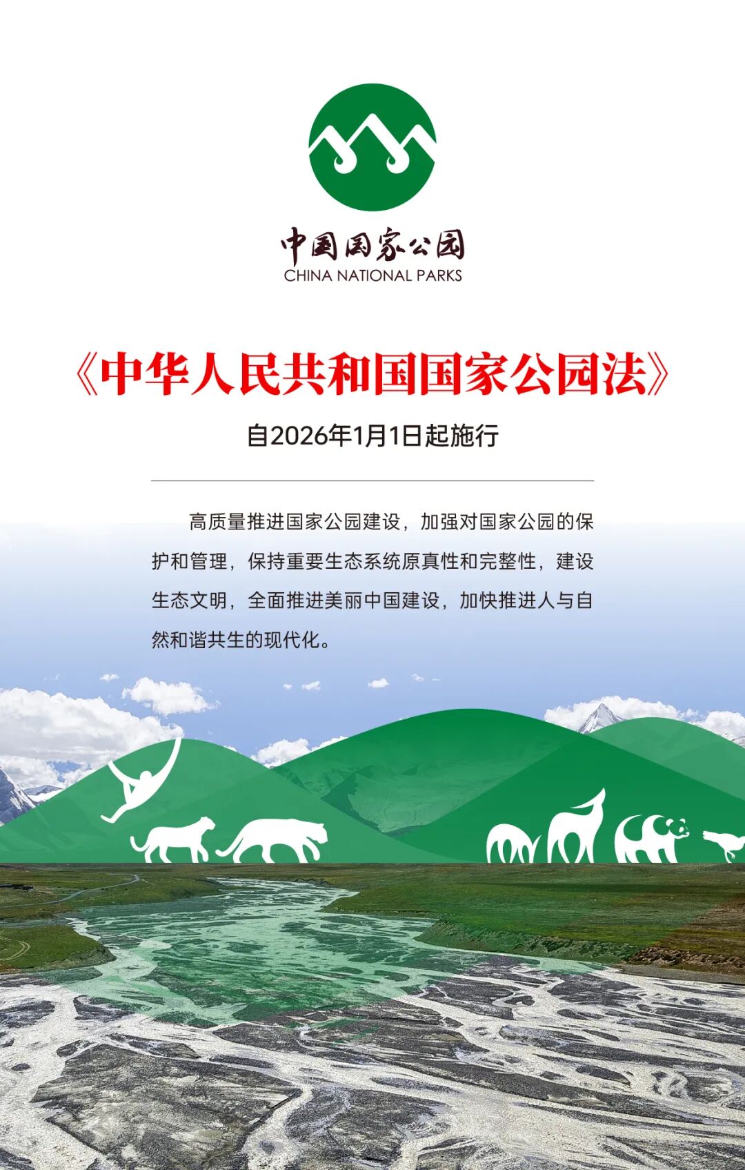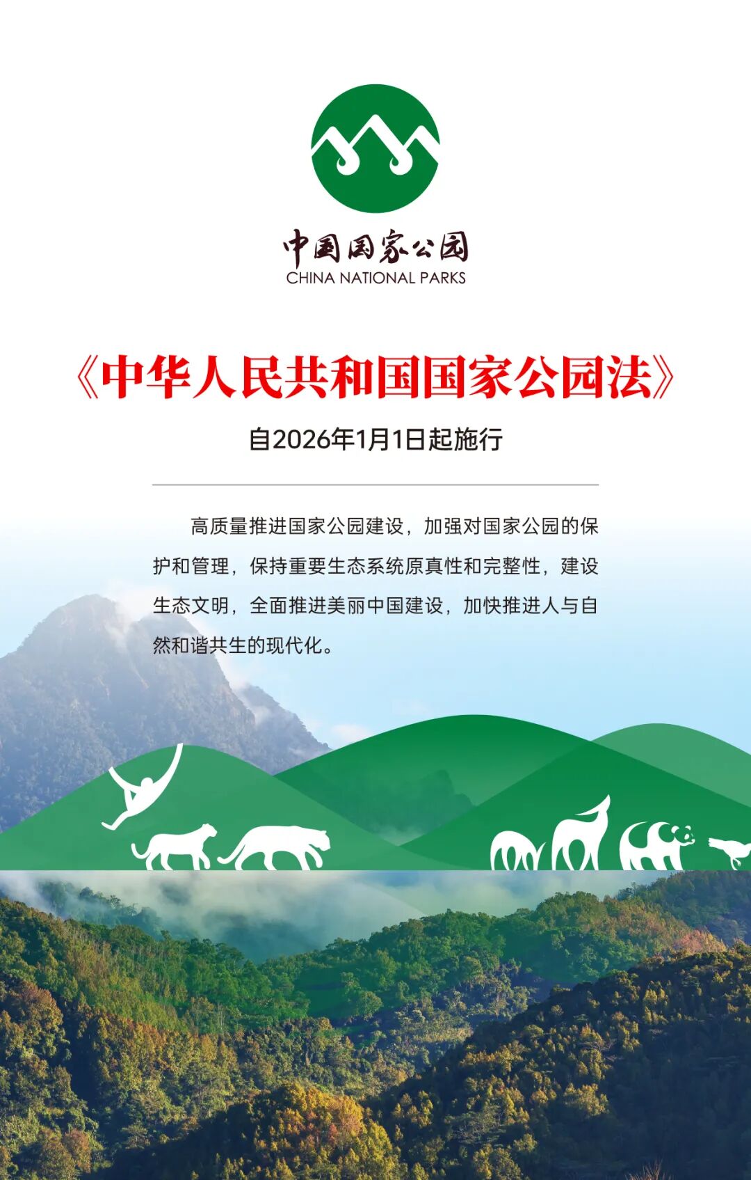 《中华人民共和国国家公园法》自2026年1月1日起施行。该法共7章63条,覆盖国家公园布局设立、保护管理、参与共享、保障监督等重要环节,标志着我国国家公园建设进入了法治化、规范化的新阶段,对于推进美丽中国建设、实现人与自然和谐共生的现代化具有重大而深远的意义。