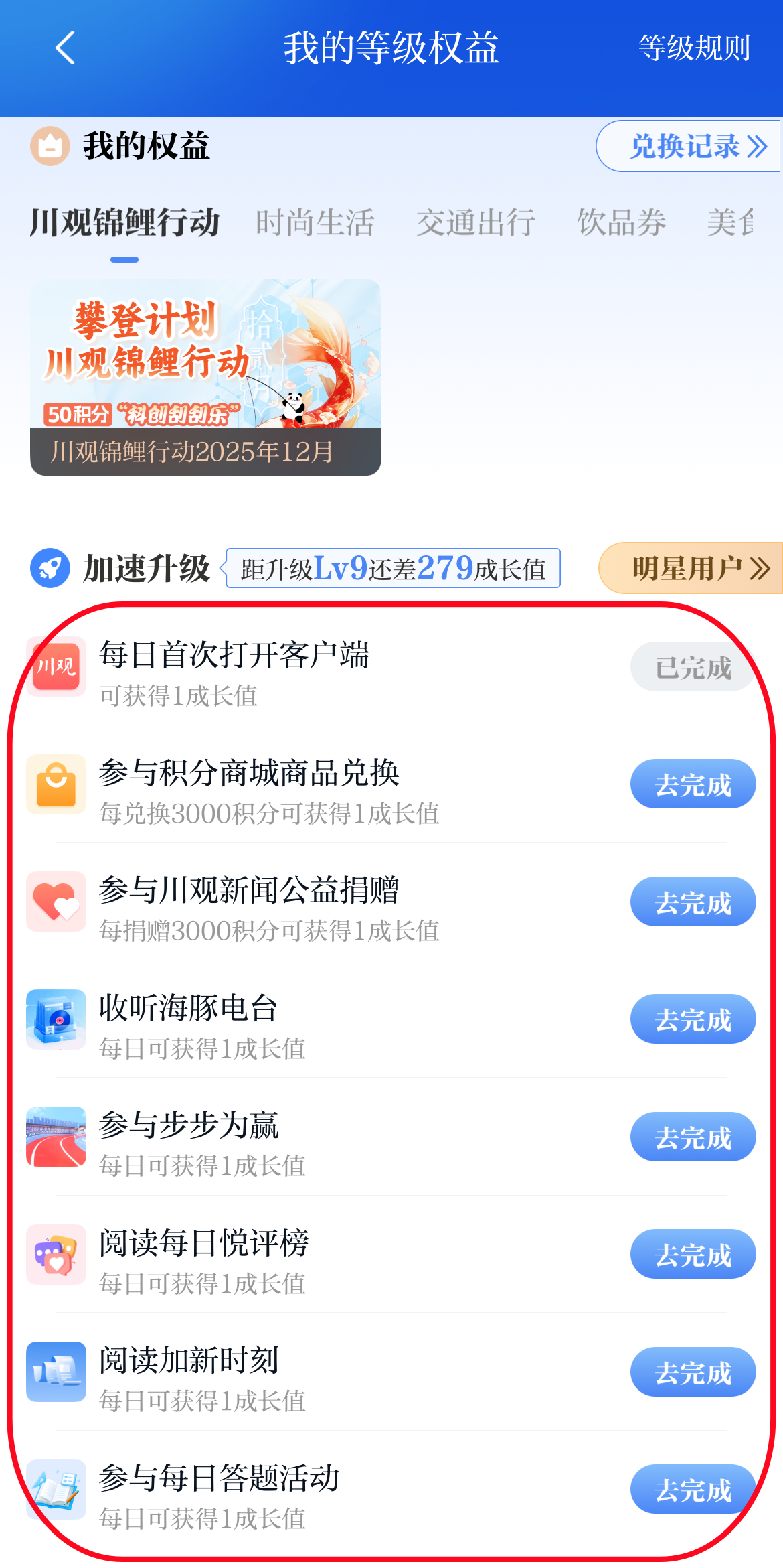 第四步:点击“去完成”,即可根据提示获取成长值。