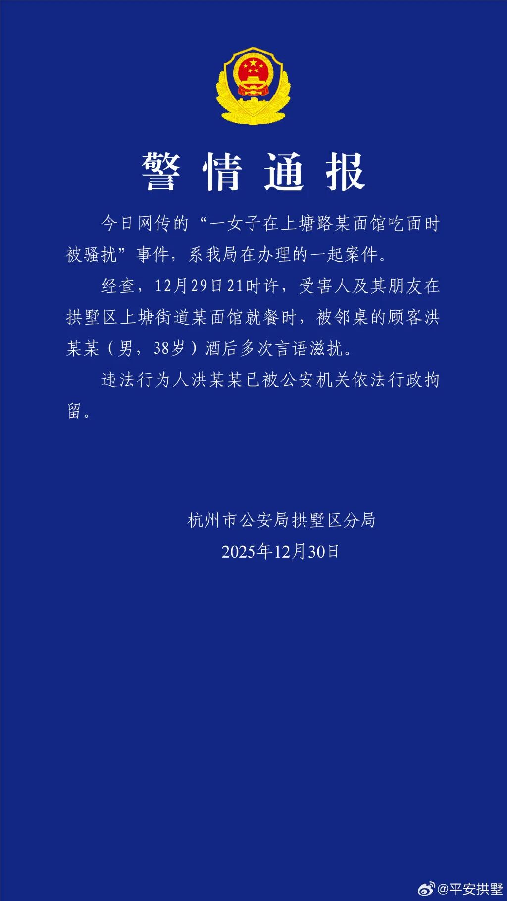 12月30日,杭州市公安局拱墅区分局针对“一女子在面馆吃面被骚扰”事件发布警情通报,违法行为人洪某某(男,38岁)已被公安机关依法行政拘留。