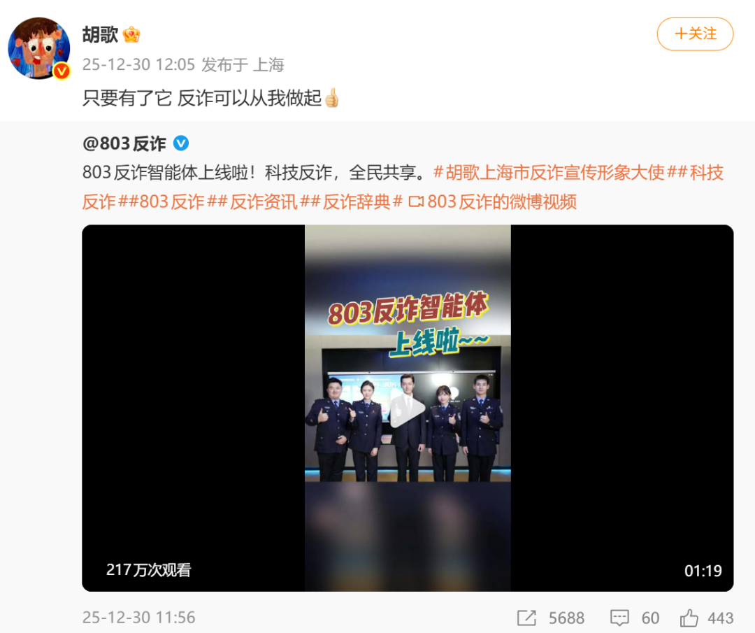 今天(12月30日),上海市反电信网络诈骗中心上线面向全国的反诈APP— “803反诈”智能体、推出书籍《803反诈指南》,同时宣布知名演员胡歌获邀担任“上海市反诈宣传形象大使”。