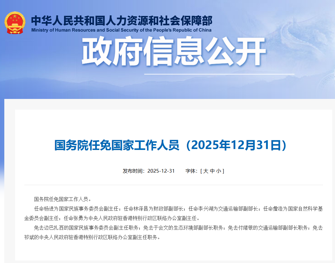 据人力资源和社会保障部网站12月31日消息,国务院任免国家工作人员。