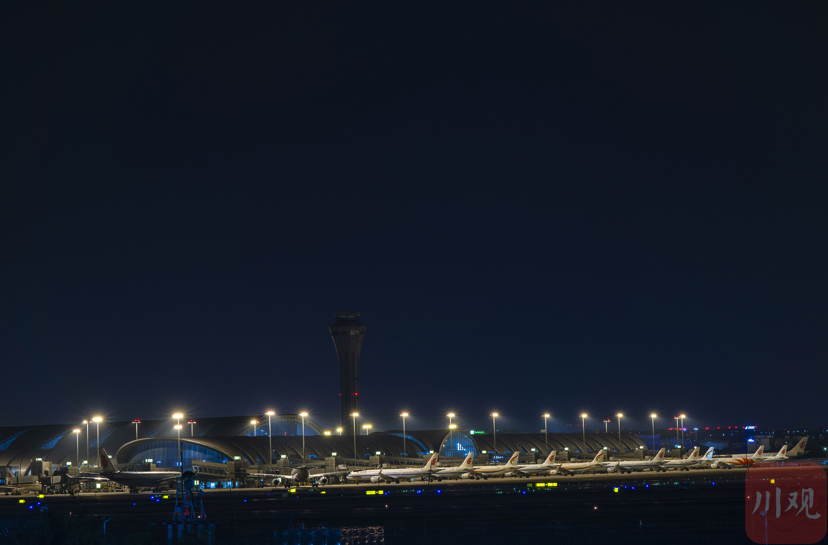 2022年9月11日夜间,成都双流国际机场停机坪灯火璀璨,数十架民航客机依次排开、停满场地,机身光影与夜色交融,定格航空枢纽夜间繁忙瞬间。