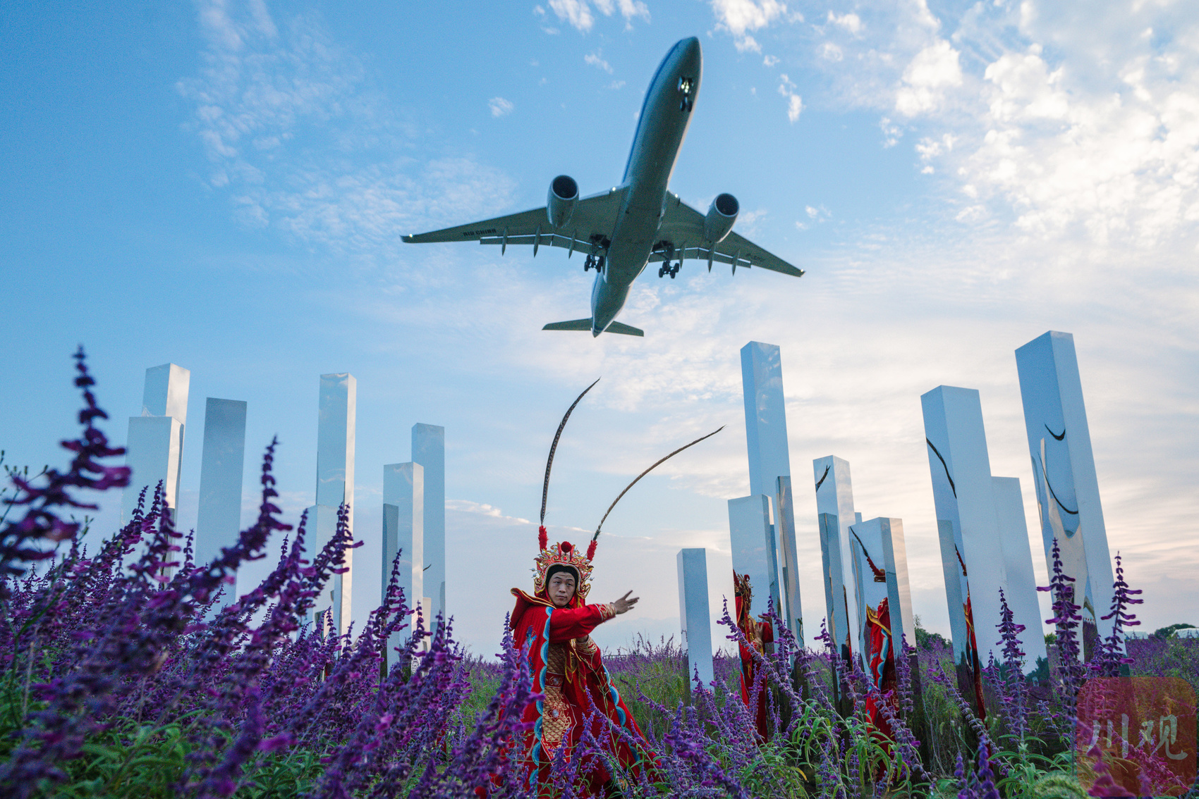 2024 年 10 月 7 日,在双流空港花田,川剧演员站在现代银色装置旁,一架飞机低空掠过,“飞机遇川剧” 成鲜活趣景。