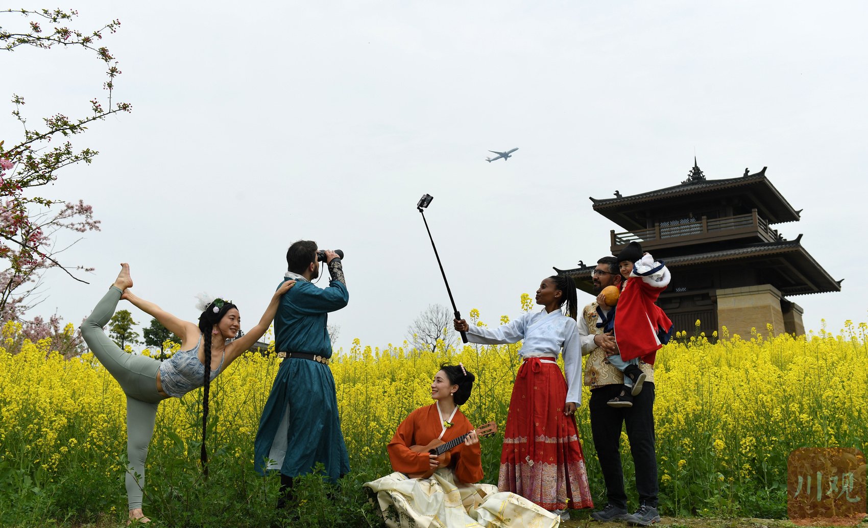 2025年3月23日,中外游客在成都市双流区瞿上田园休闲拍照留影。