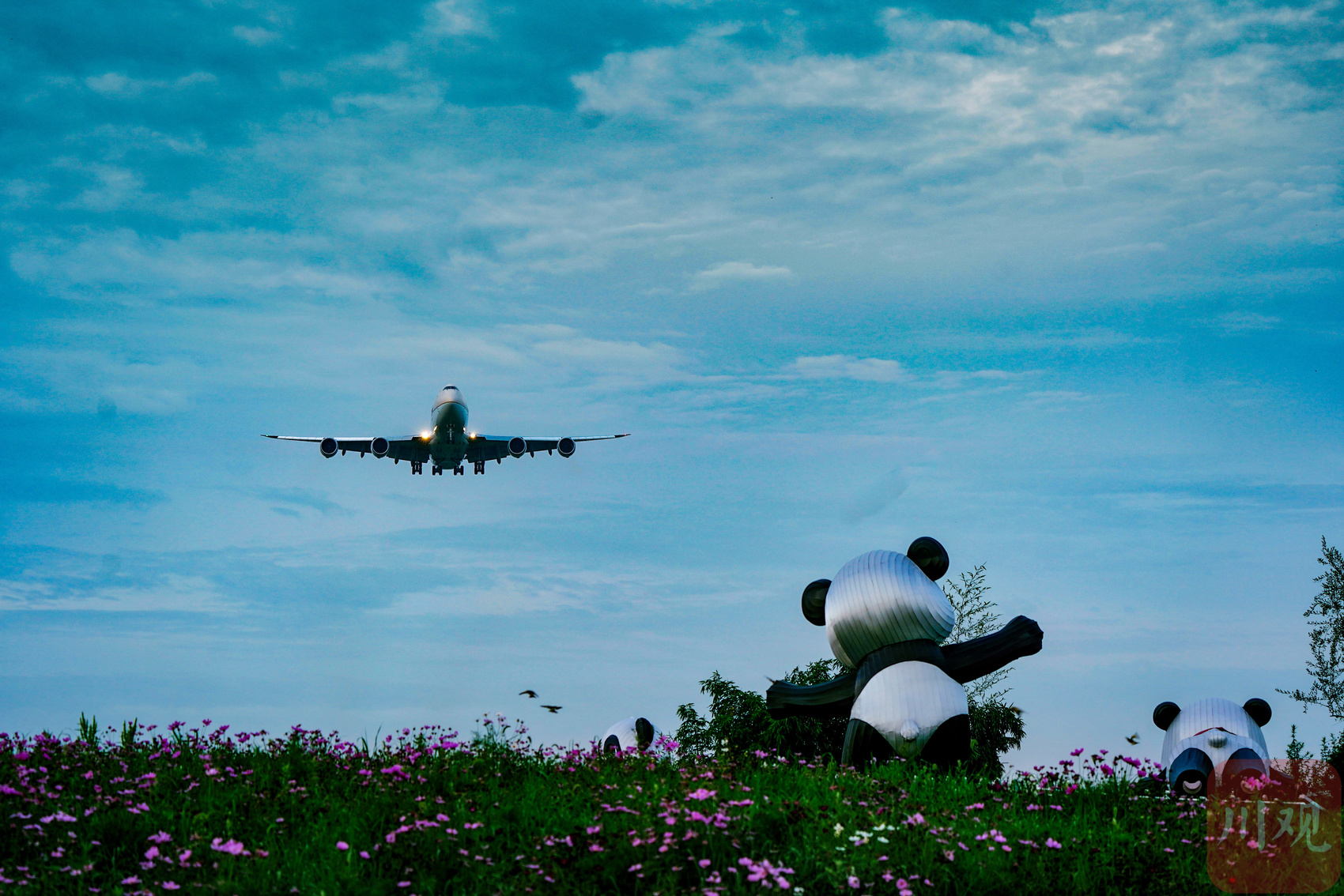 2022年6月6日清晨,一架飞机从成都市双流区空港花田降落,熊猫装置或抬臂或卧,空港萌趣景致相映。