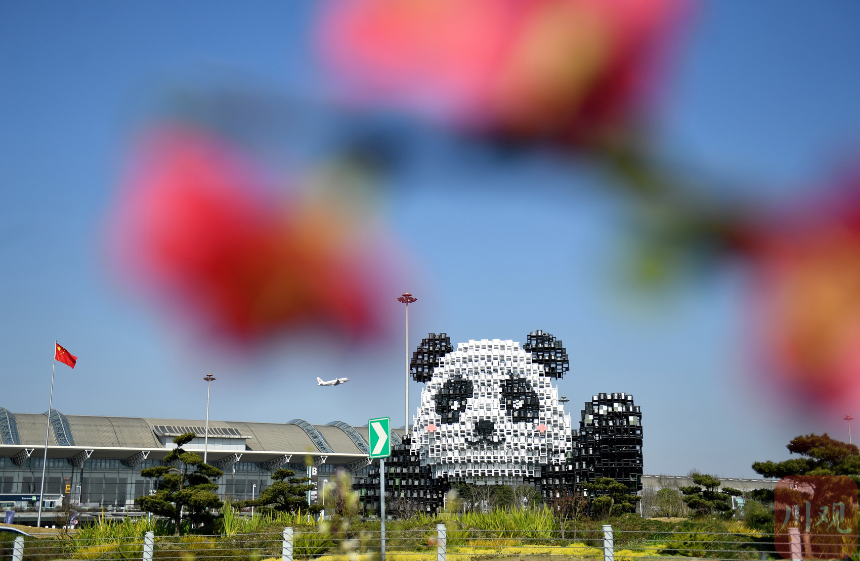 2025年2月25日,成都双流国际机场1号航站楼旁的熊猫雕塑与海棠花、飞机同框。